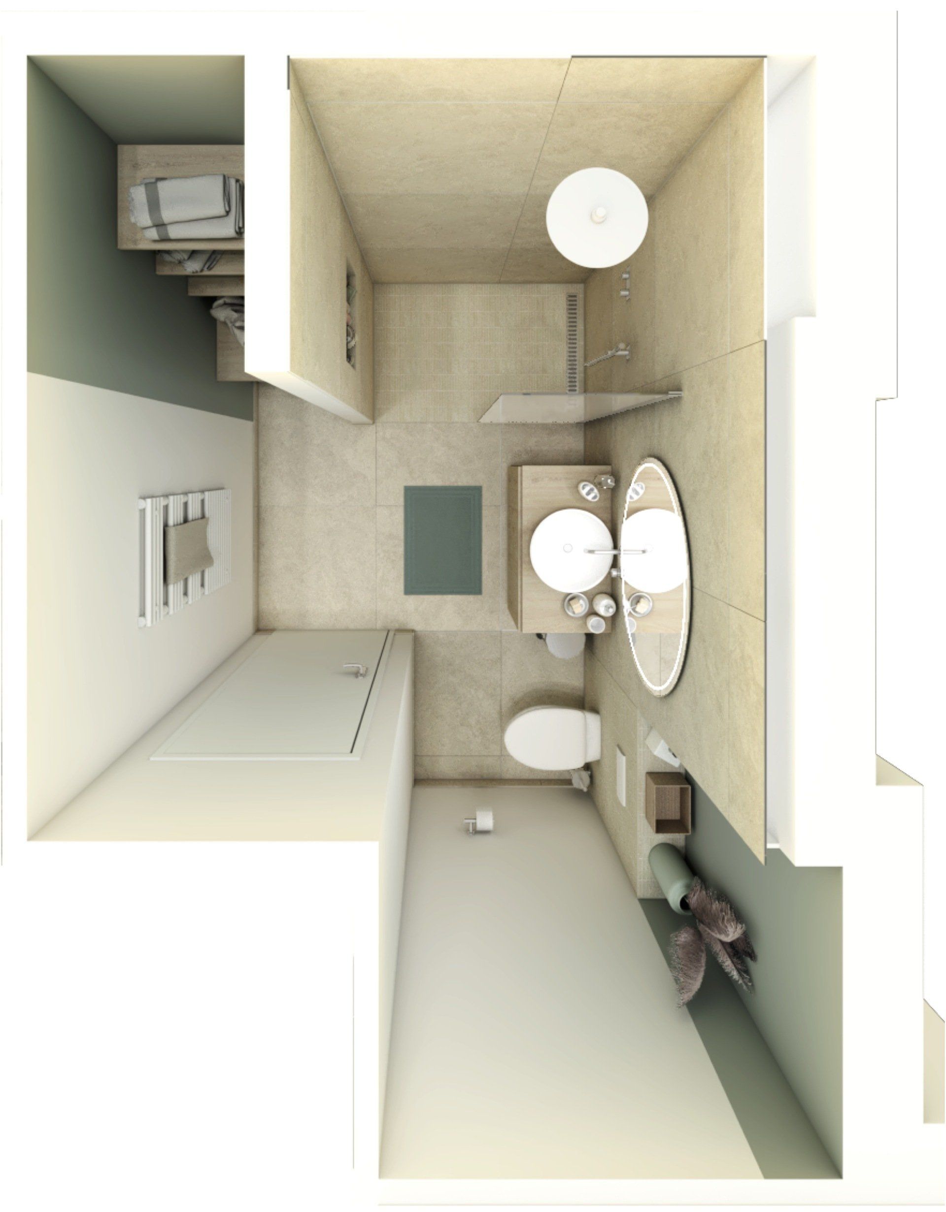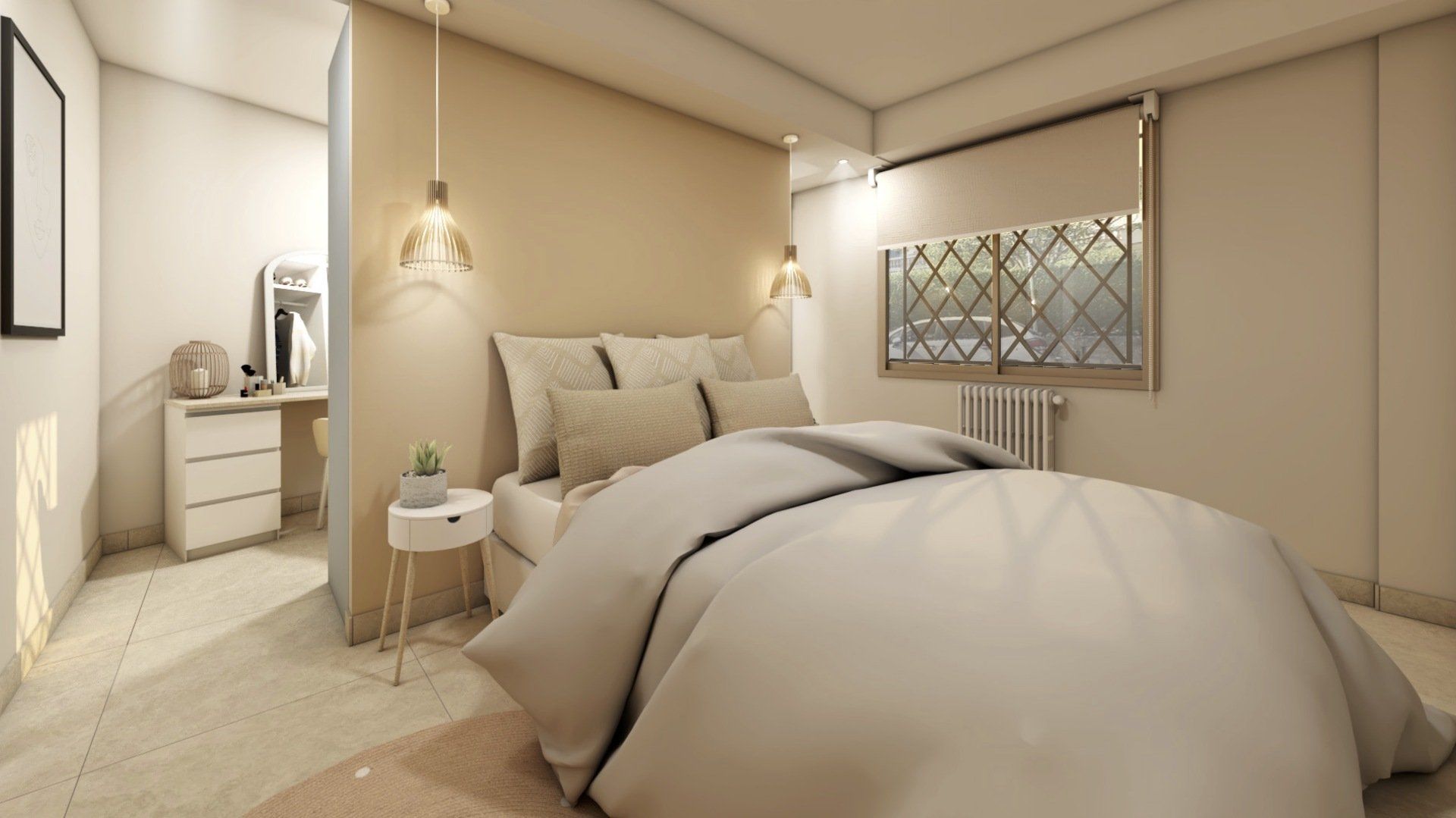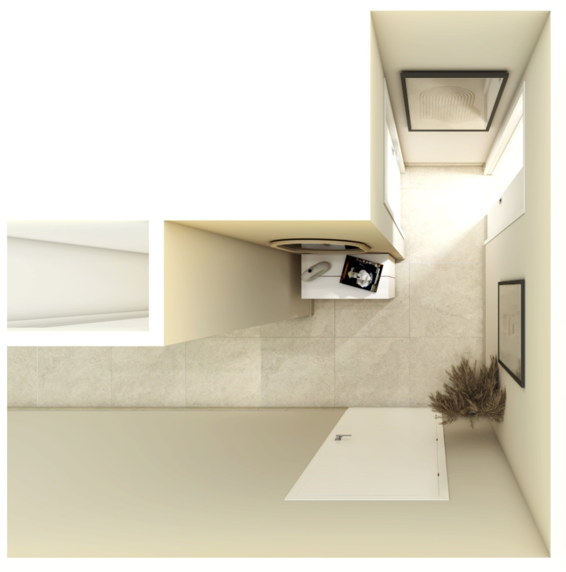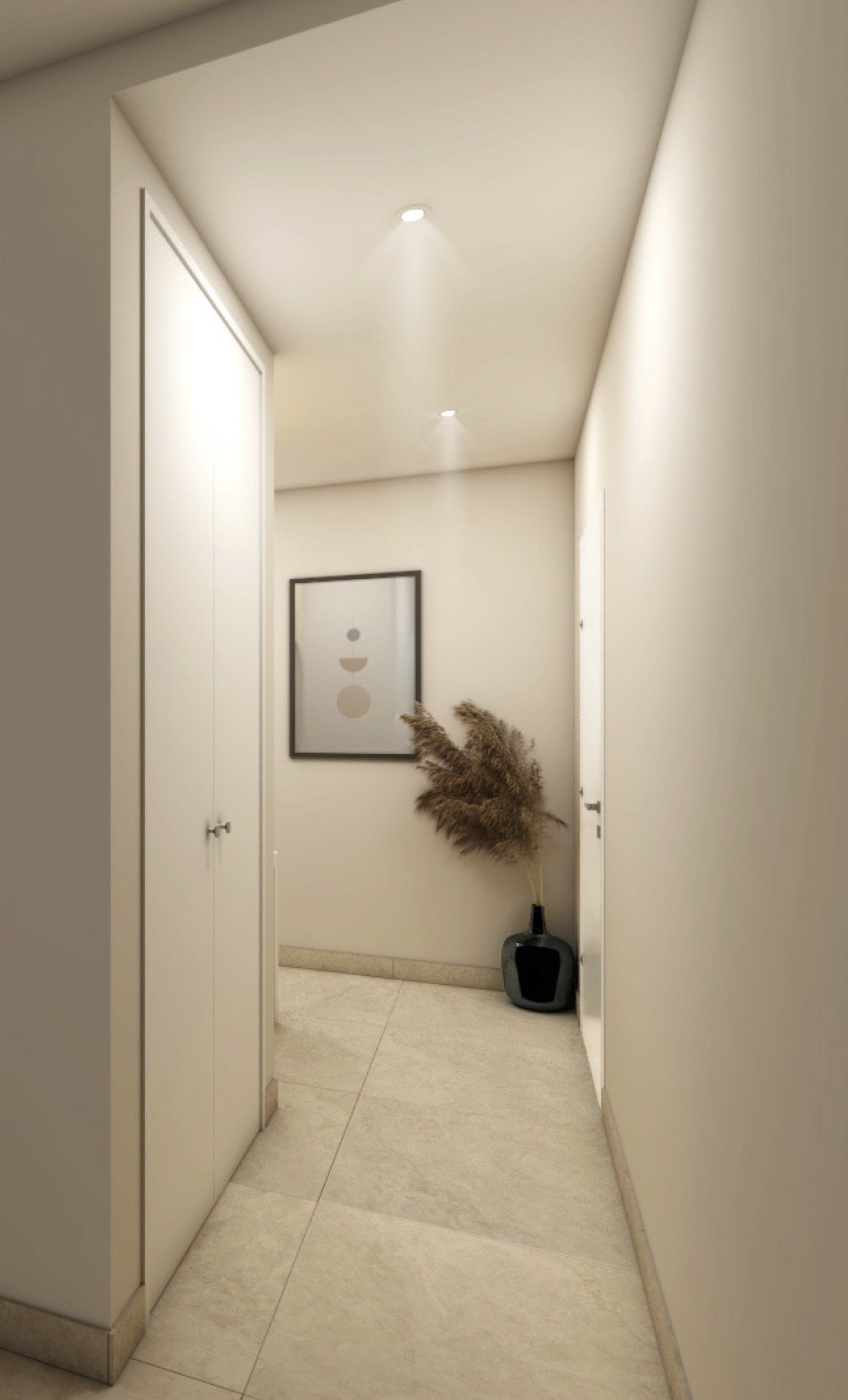 Pour répondre aux attentes du couple, j’ai proposé une restructuration complète des espaces ciblés : • La chambre a été agrandie en empiétant sur le couloir et une partie de l’entrée. • L’ancienne cuisine a été transformée en dressing, créant un espace de rangement indépendant. • La cuisine a été déplacée dans le salon, pour optimiser l’espace de vie. • La salle de bain a été étendue en reprenant un placard de l’entrée, ce qui a permis d’y intégrer une machine à laver. • À leur demande, les WC ont été intégrés dans la salle de bain.