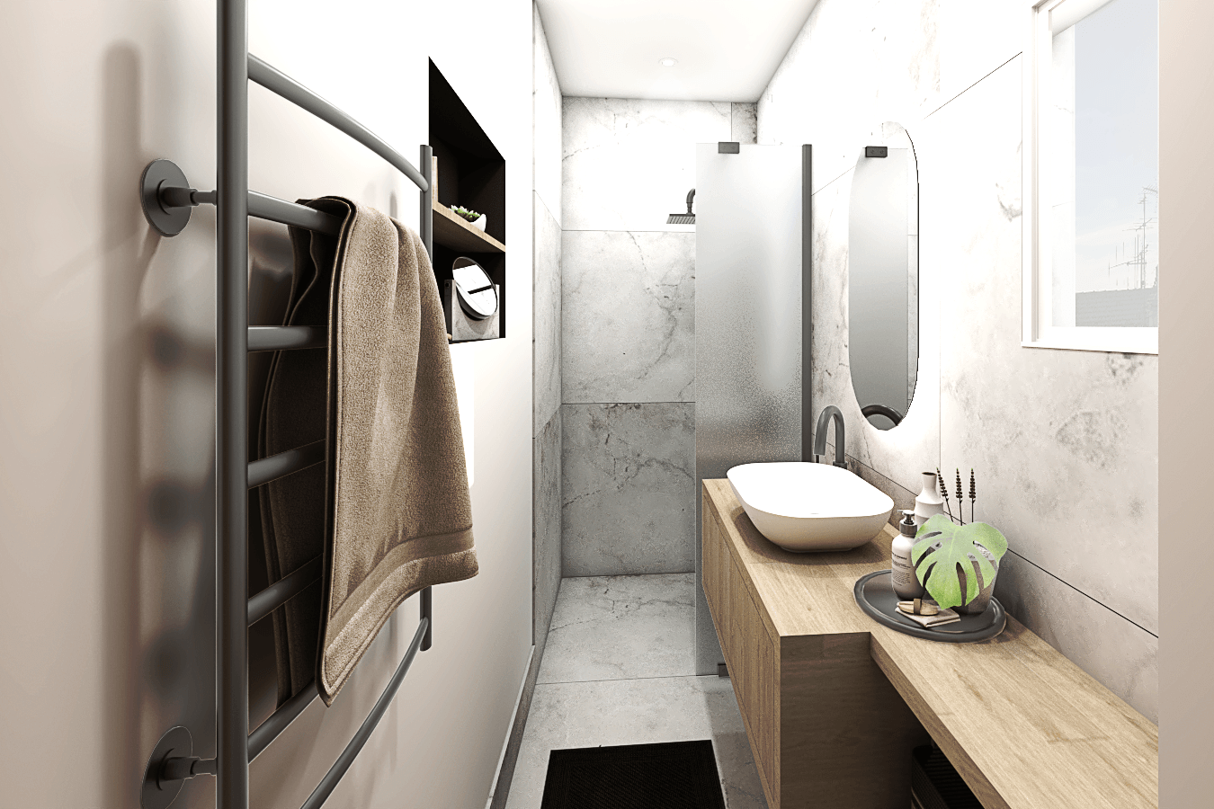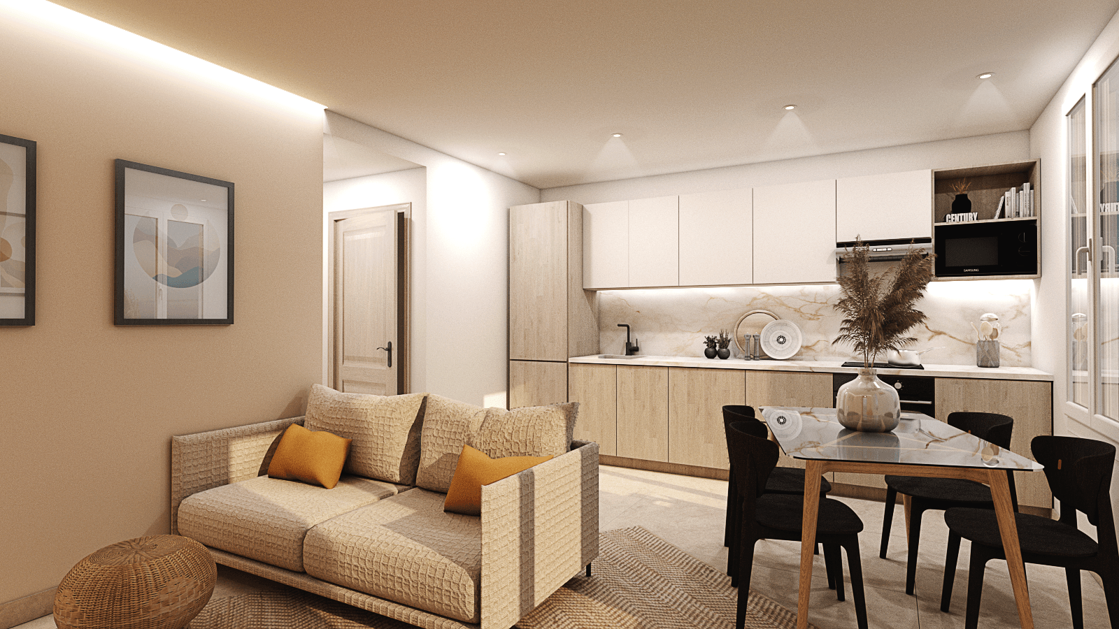 • Redéfinir les espaces pour rendre le logement fonctionnel et attractif, tout en respectant les contraintes techniques liées à l’existant. • Recréer une séparation nette entre cet appartement et l’unité voisine, à laquelle il était auparavant relié. • Ouvrir la cuisine sur la pièce de vie, pour un espace plus convivial. • Créer de nouveaux usages (coin repas, buanderie, rangements sur mesure) dans une surface limitée. • Travailler sur un budget maîtrisé, tout en proposant un aménagement durable et cohérent pour un futur acquéreur ou locataire.