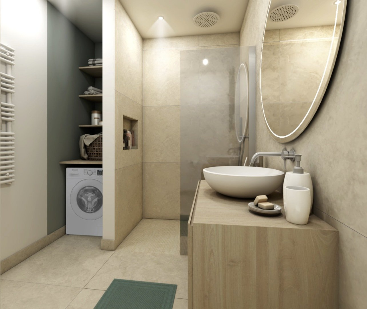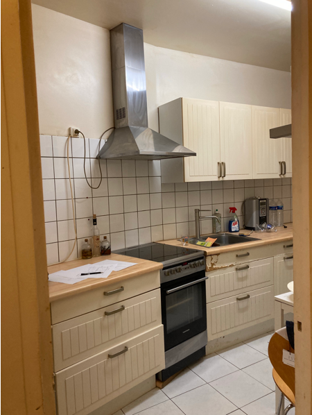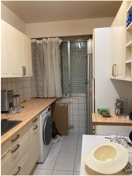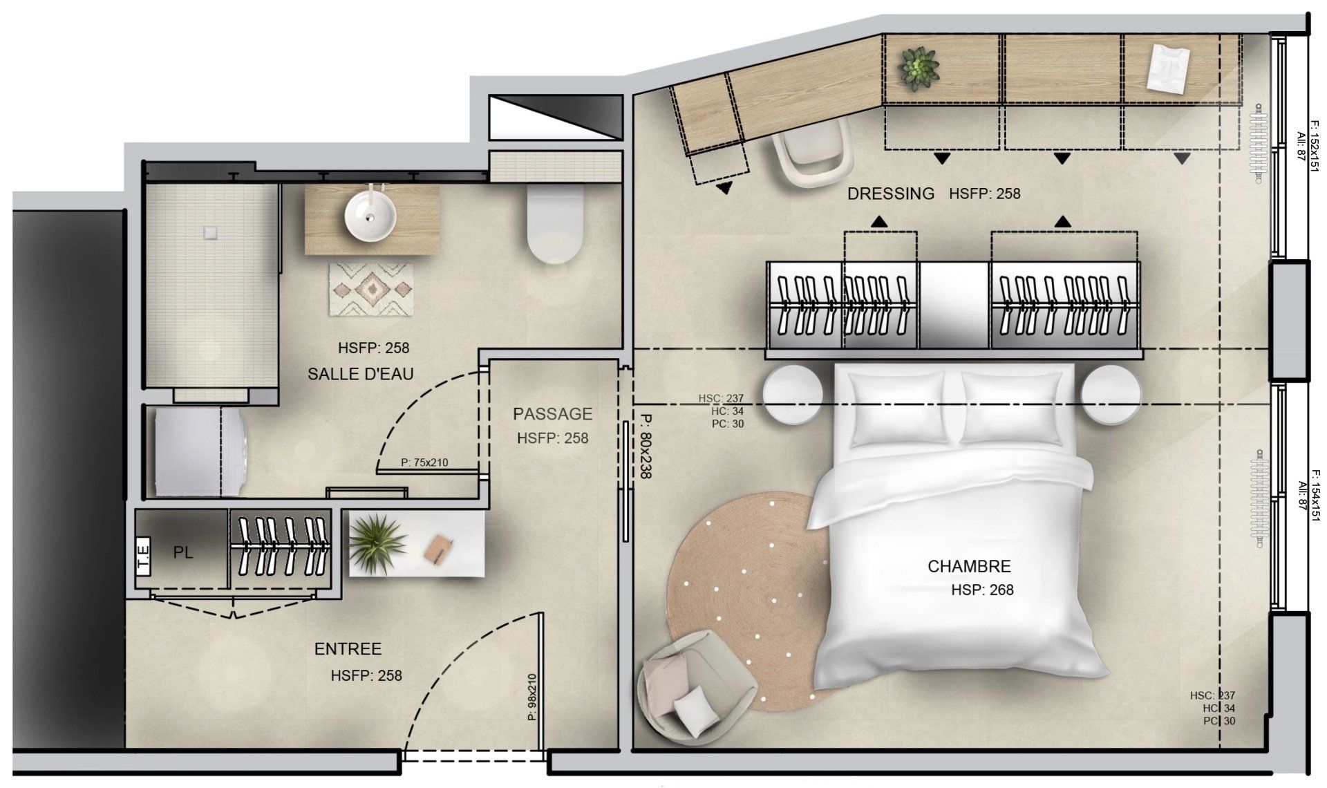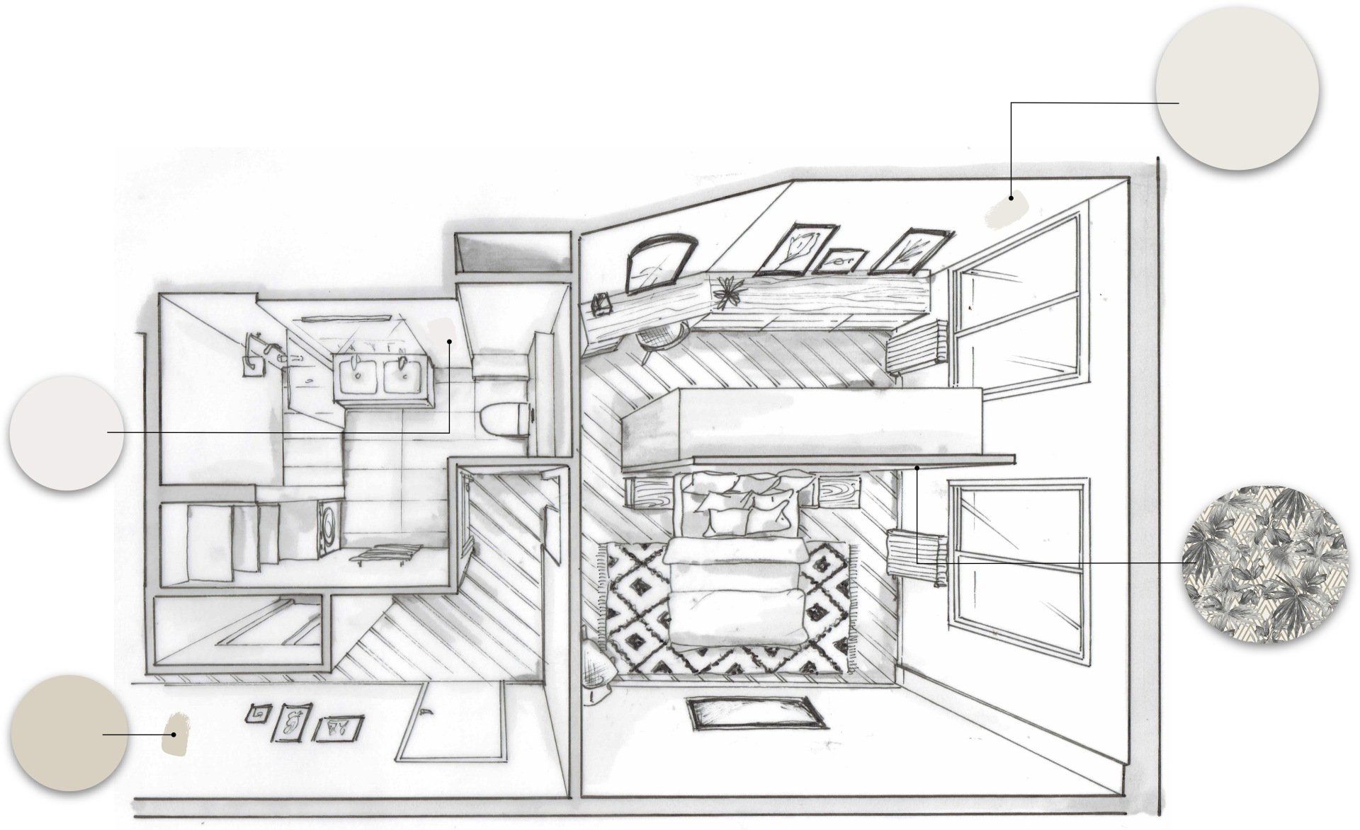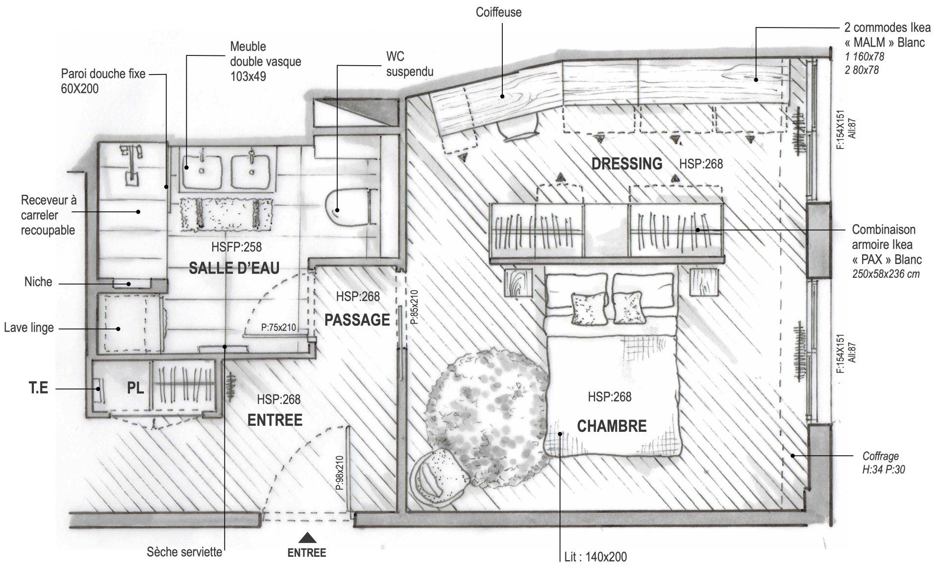 Pour répondre aux attentes du couple, j’ai proposé une restructuration complète des espaces ciblés : • La chambre a été agrandie en empiétant sur le couloir et une partie de l’entrée. • L’ancienne cuisine a été transformée en dressing, créant un espace de rangement indépendant. • La cuisine a été déplacée dans le salon, pour optimiser l’espace de vie. • La salle de bain a été étendue en reprenant un placard de l’entrée, ce qui a permis d’y intégrer une machine à laver. • À leur demande, les WC ont été intégrés dans la salle de bain.