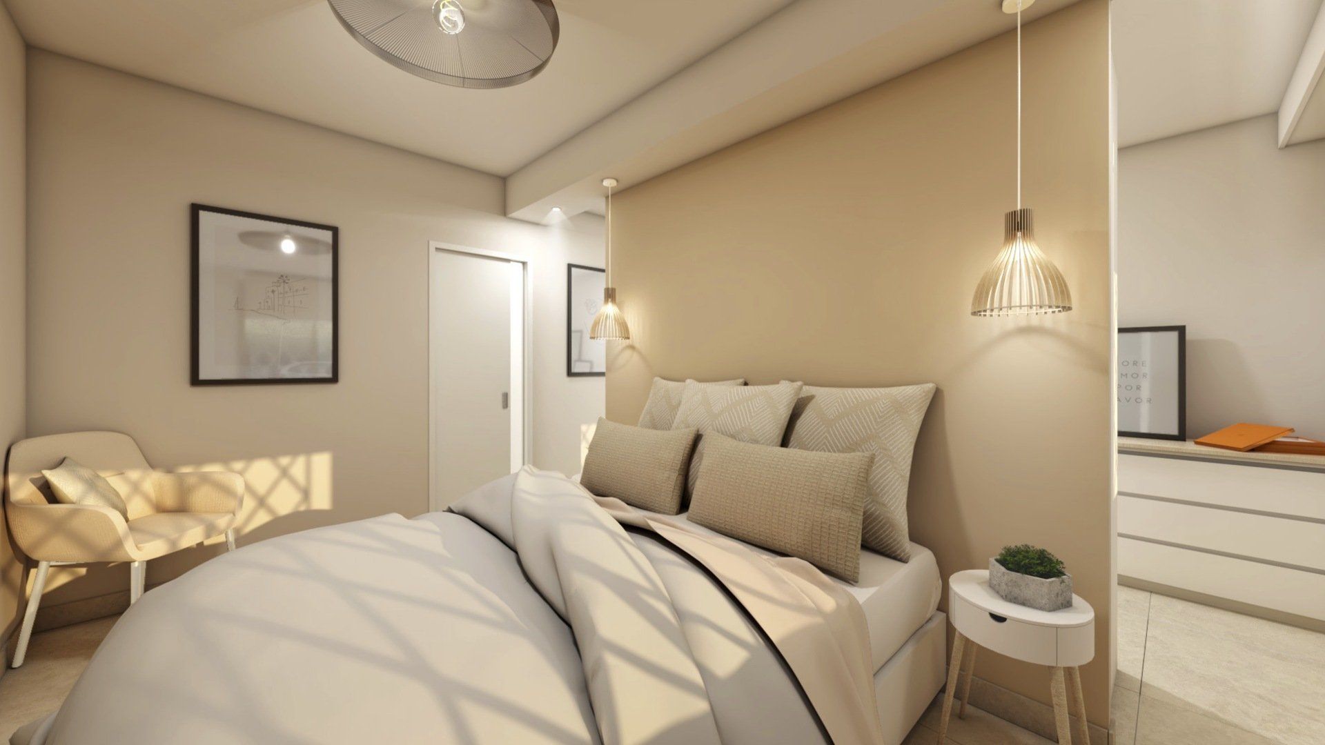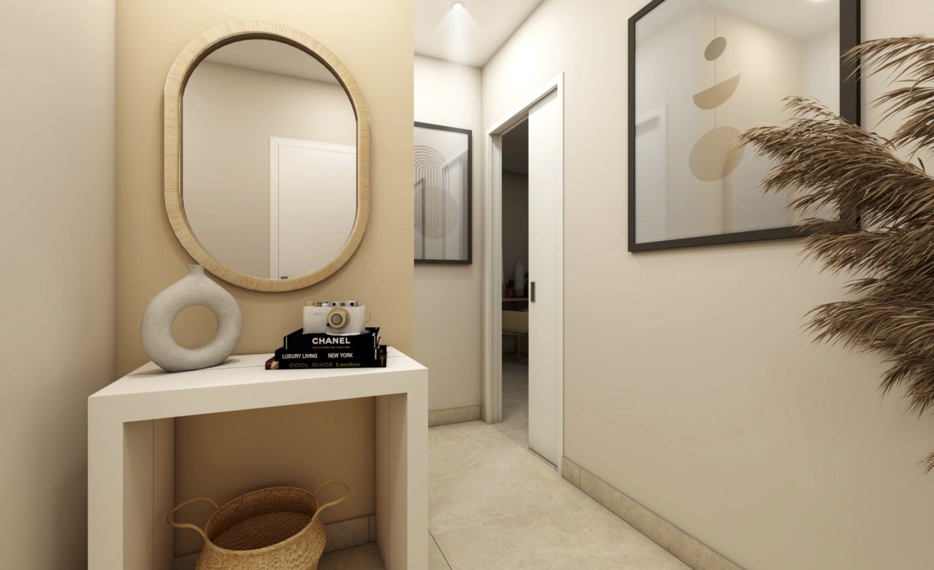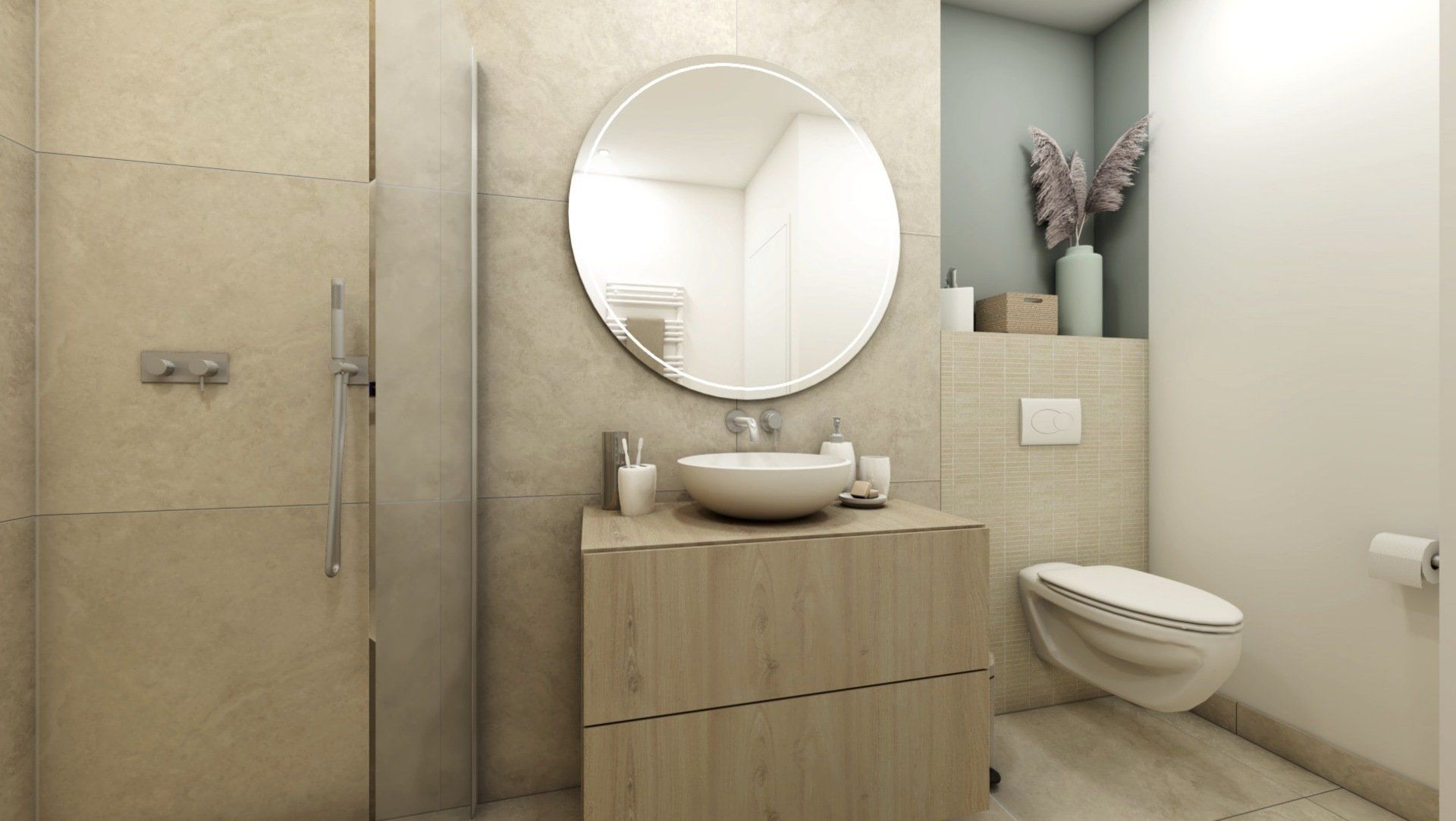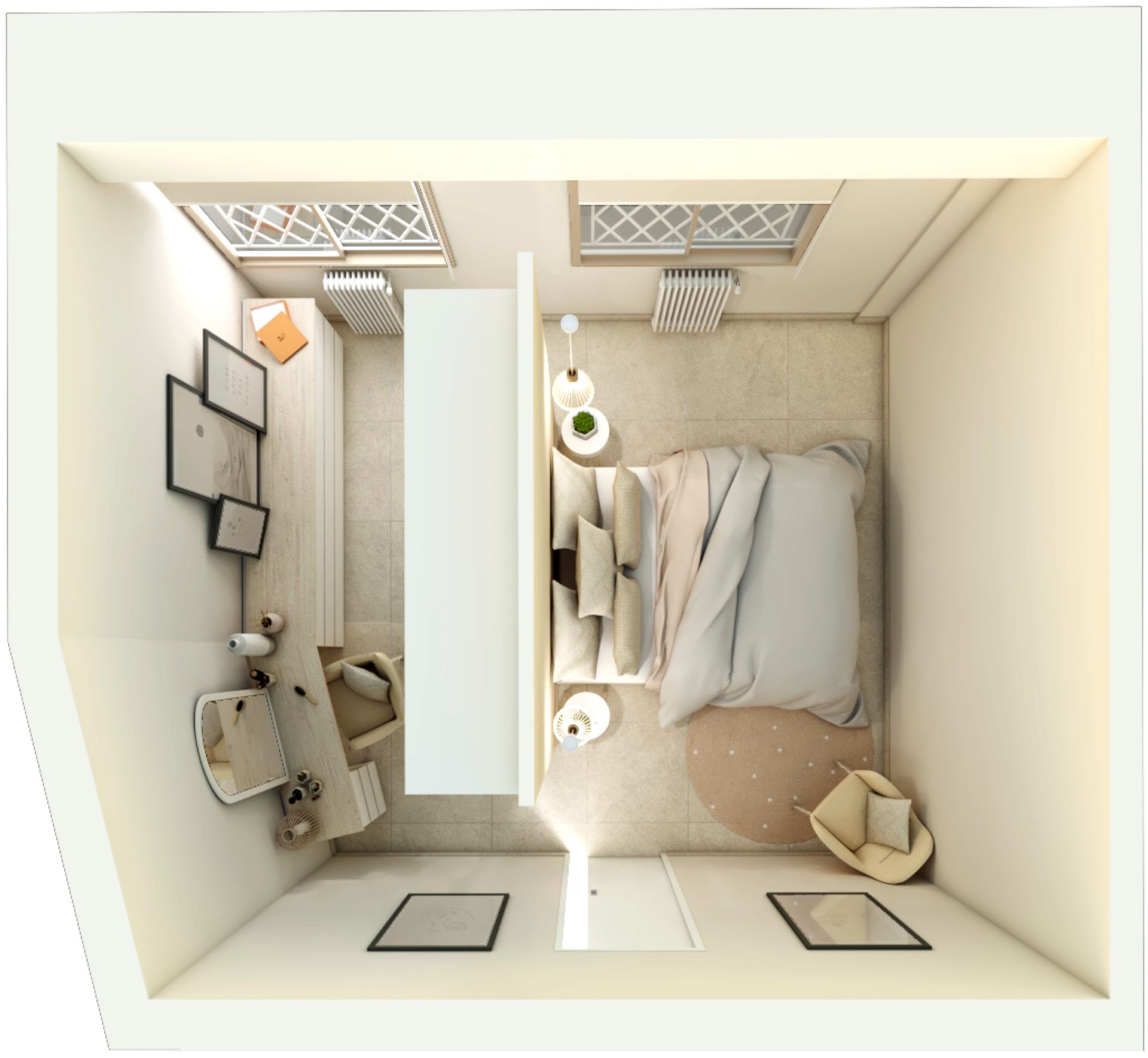 Pour répondre aux attentes du couple, j’ai proposé une restructuration complète des espaces ciblés : • La chambre a été agrandie en empiétant sur le couloir et une partie de l’entrée. • L’ancienne cuisine a été transformée en dressing, créant un espace de rangement indépendant. • La cuisine a été déplacée dans le salon, pour optimiser l’espace de vie. • La salle de bain a été étendue en reprenant un placard de l’entrée, ce qui a permis d’y intégrer une machine à laver. • À leur demande, les WC ont été intégrés dans la salle de bain.