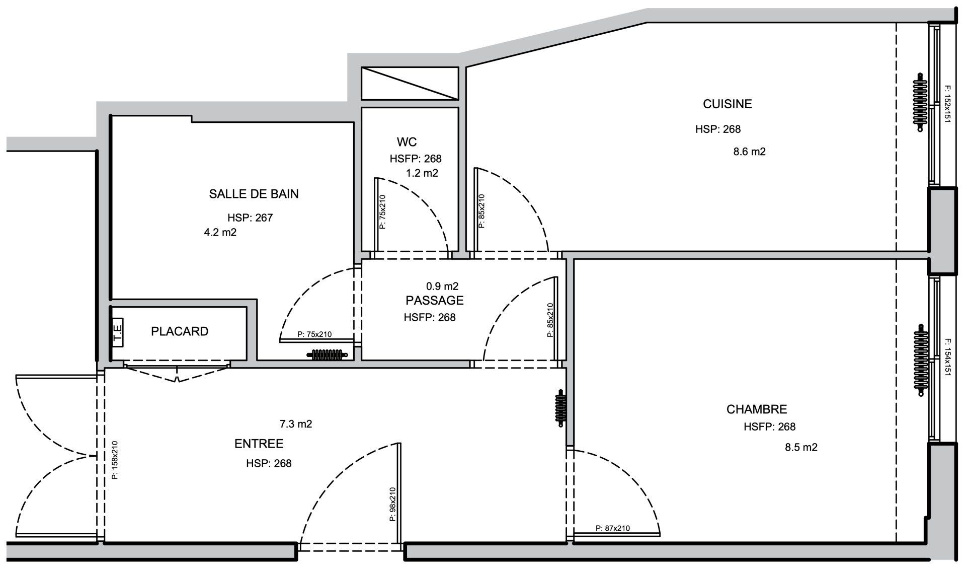 • Réduire les surfaces perdues (entrée/couloirs) au profit des espaces utiles. • Agrandir la chambre pour en faire un vrai cocon confortable. • Créer un dressing dans l’ancienne cuisine devenue inutile. • Ouvrir la cuisine sur le salon, pour créer une pièce de vie conviviale et moderne. • Réunir les WC et la salle de bain, à leur demande. • Intégrer un espace buanderie malgré la surface réduite.
