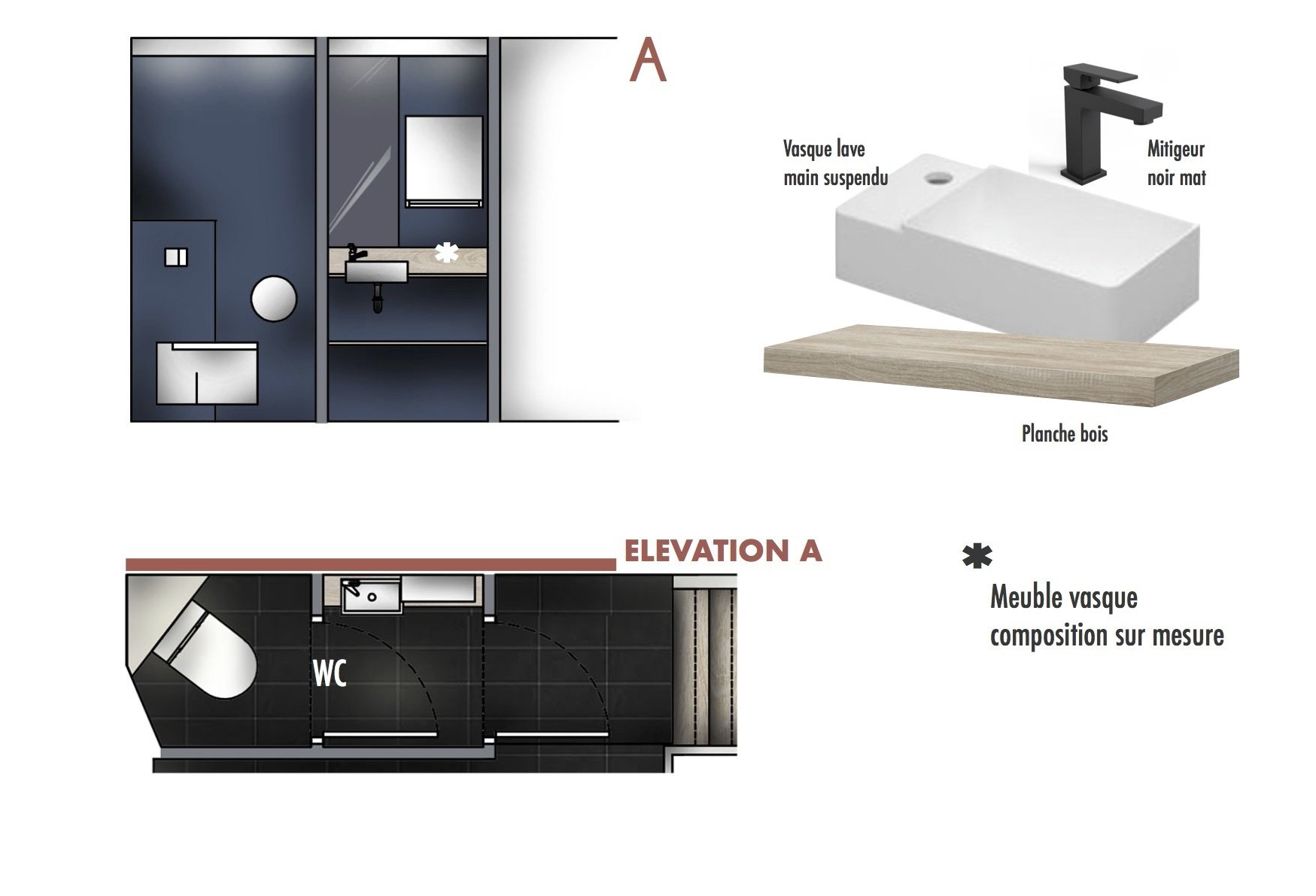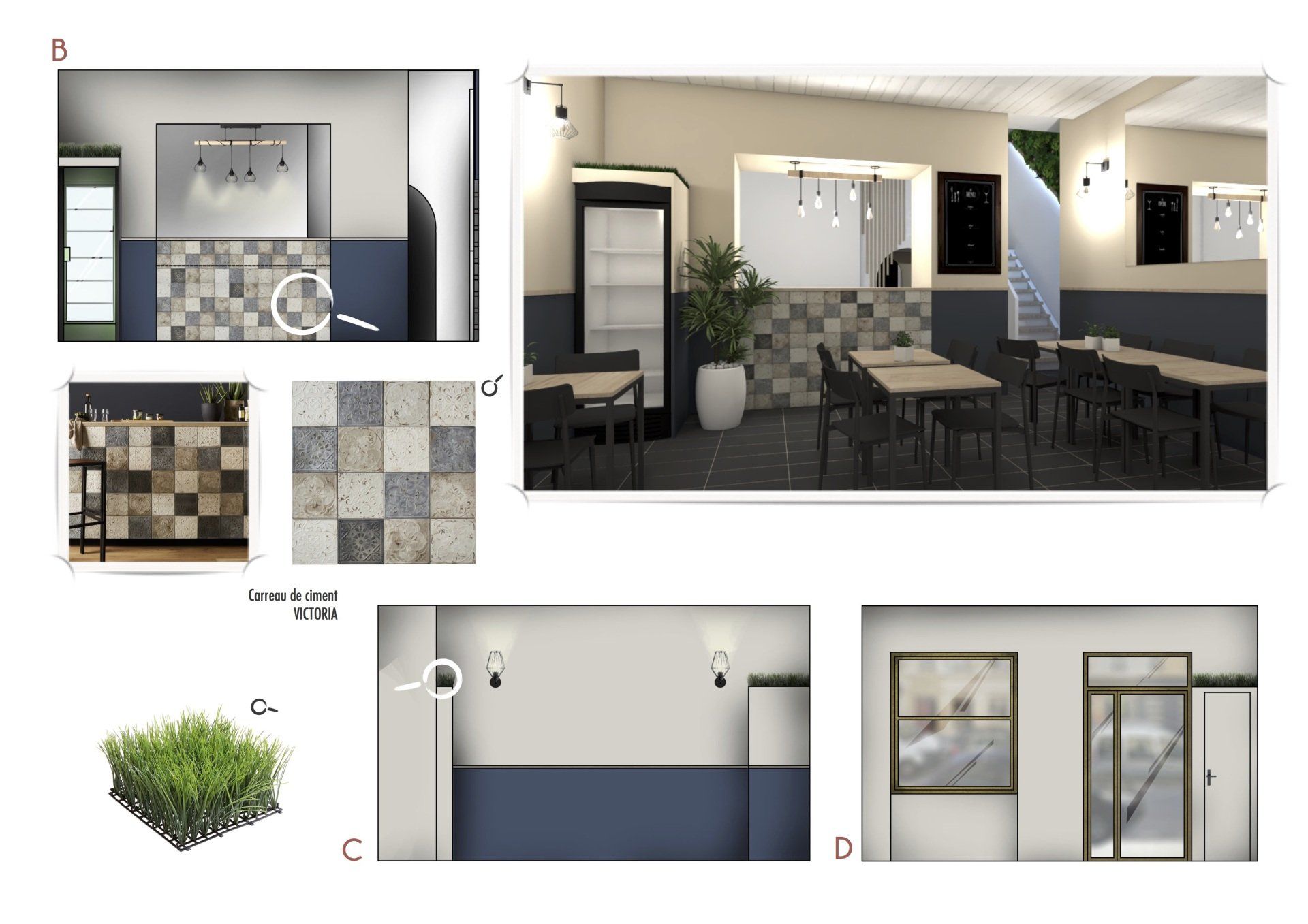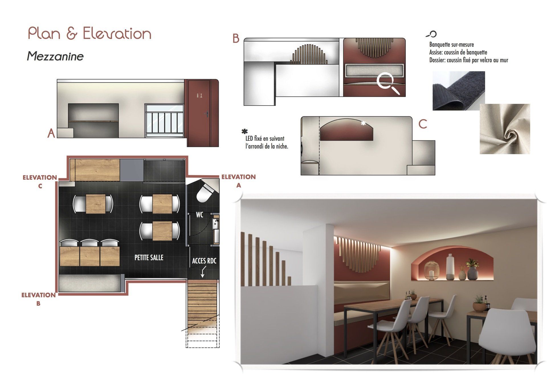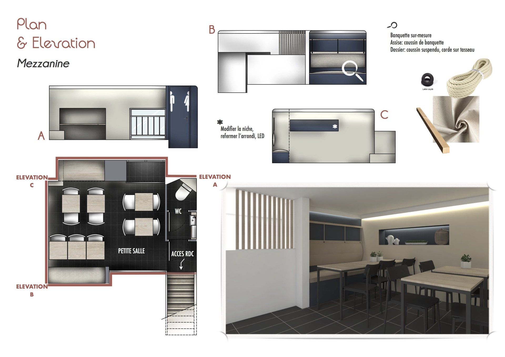 J’ai proposé deux concepts déco complets, articulés autour de planches d’ambiance, élévations, plan d’implantation et shopping list pour guider la réalisation. Le tout en respectant les contraintes du lieu existant